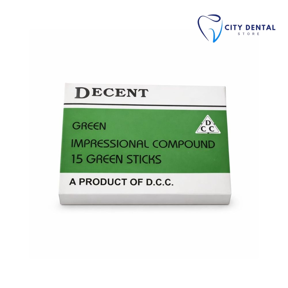 Decent impression compound (green sticks) is a thermoplastic dental material used for primary impressions and border molding in prosthodontics. It softens with heat, hardens on cooling, and provides accurate detail of oral tissues, making it reliable for denture and prosthetic procedures.