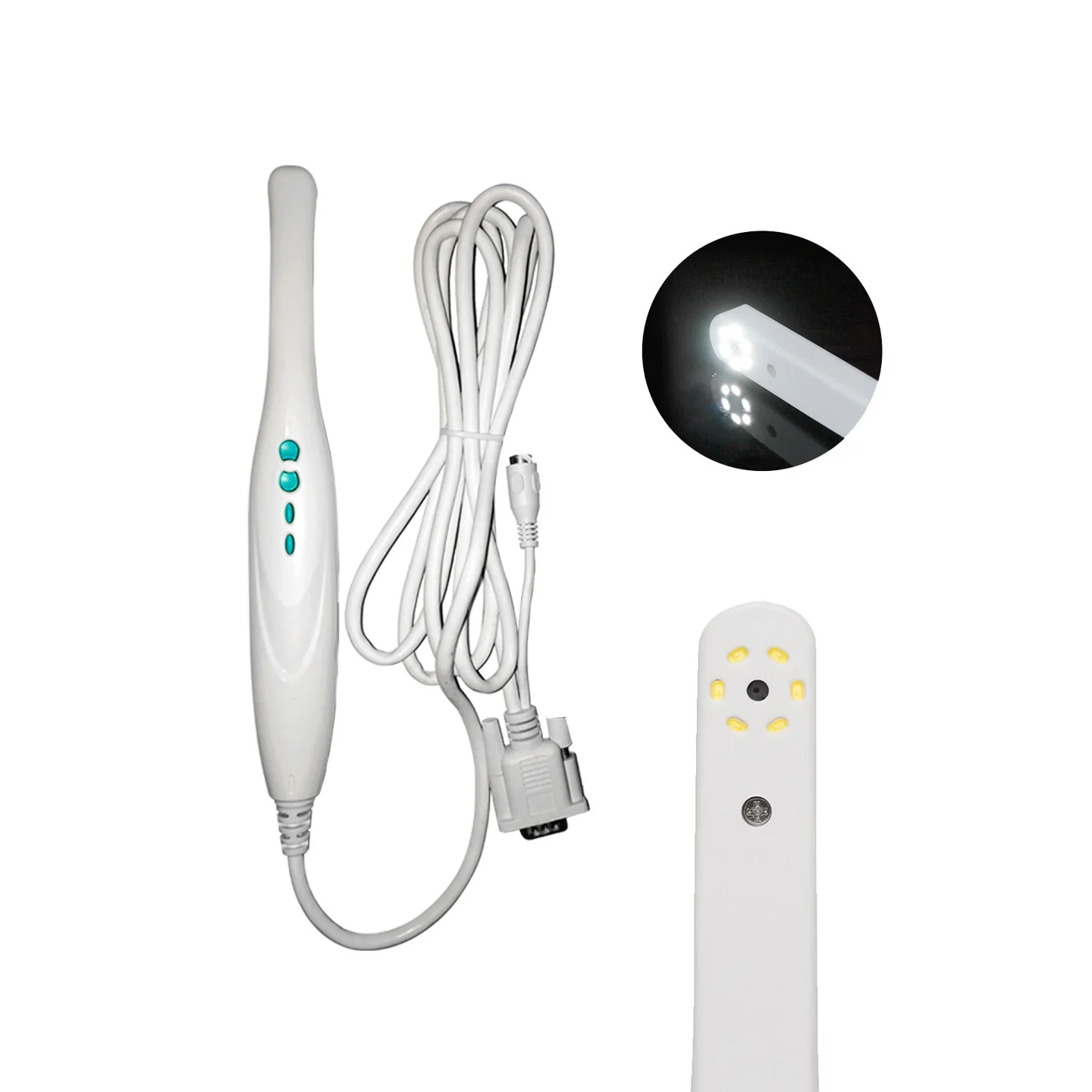 Dental intraoral camera with LED and VGA output provides a clear, real-time view of the oral cavity, aiding in diagnosis, treatment planning, and patient education. The camera utilizes a built-in LED light source for enhanced illumination and a VGA interface for displaying images on a monitor.